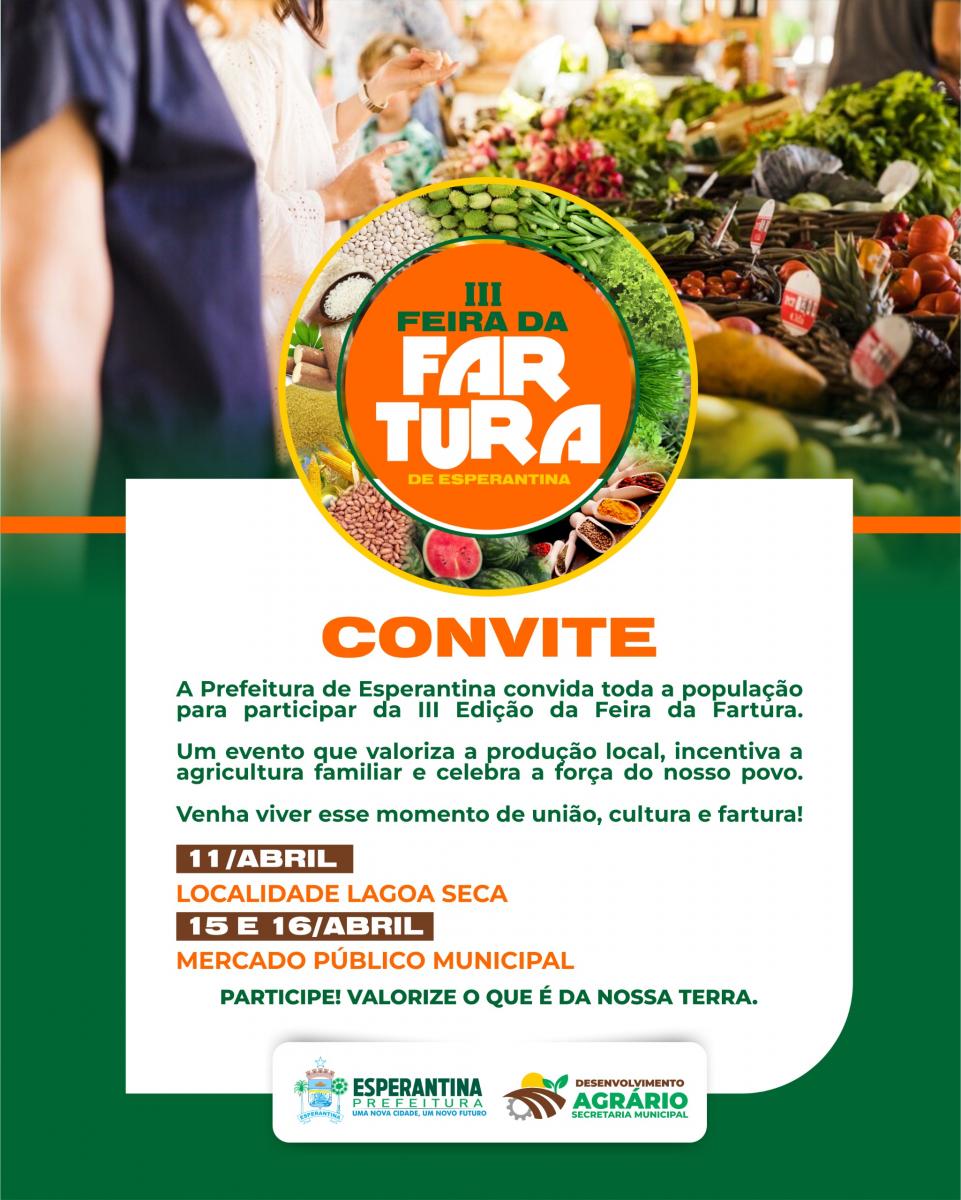 A Feira da Fartura é uma realização da Prefeitura de Esperantina, por meio da Secretaria Municipal de Desenvolvimento Agrário, Empreendedorismo e Trabalho.
